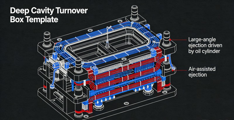 Solution: Design multi-layer serial high-speed cooling channels densely covering all thick-walled areas. For deep-cavity containers, combine “hydraulic cylinder-driven large-angle inclined ejectors” with “gas-assisted ejection” to ensure smooth, rapid demolding in minimal time without deformation or vacuum adhesion, minimizing production cycles.