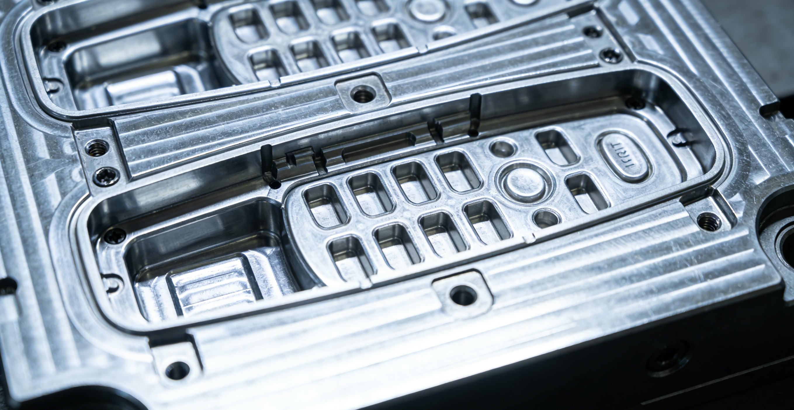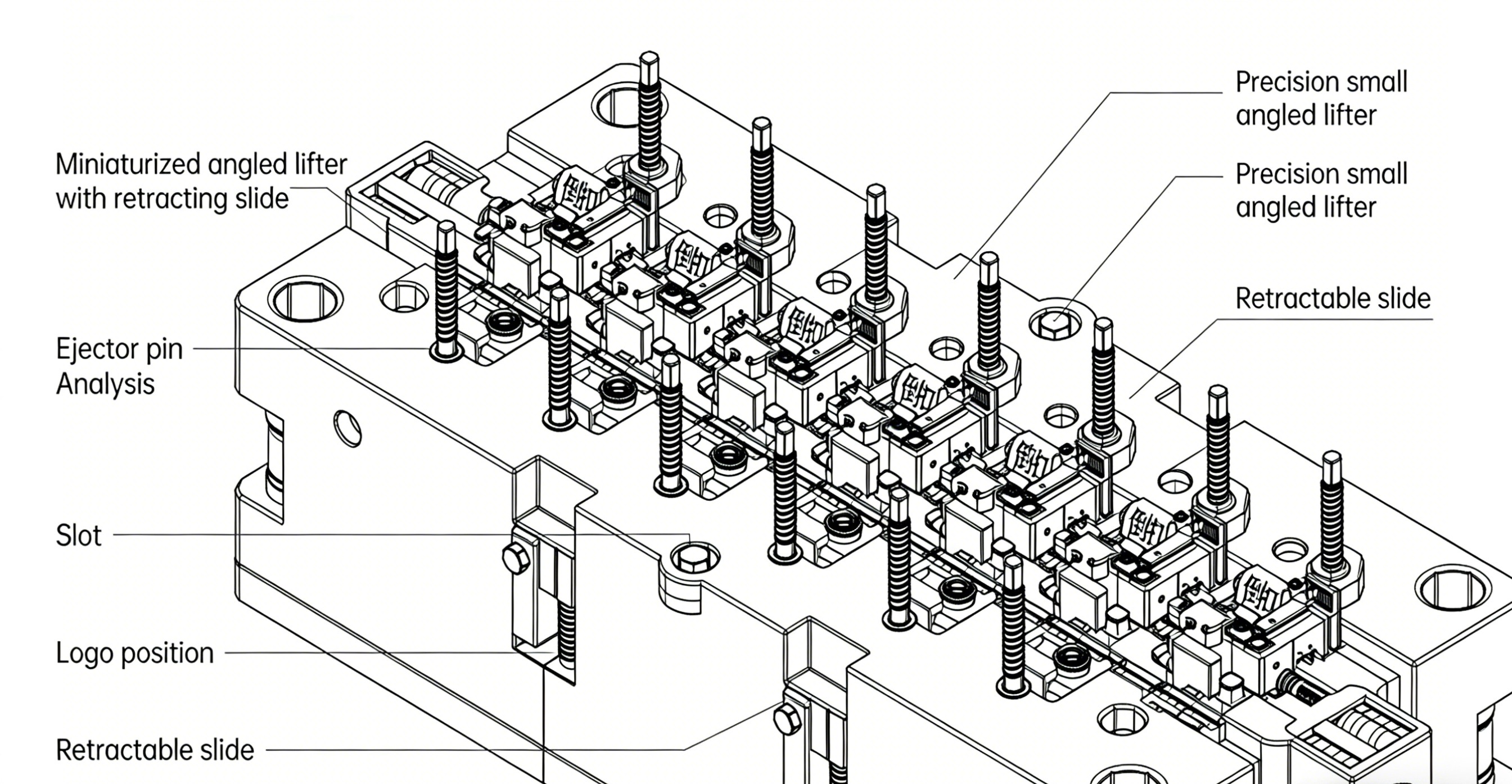 Solution: Design a “multi-group micro-tapered ejector and retractable slider” combination mechanism. Compact precision micro-tapered ejectors address dense internal undercuts and ribs. For side slots or logo positions, retractable slides ensure smooth ejection without product damage. Ejector pin layout undergoes stress analysis to guarantee smooth, balanced ejection.